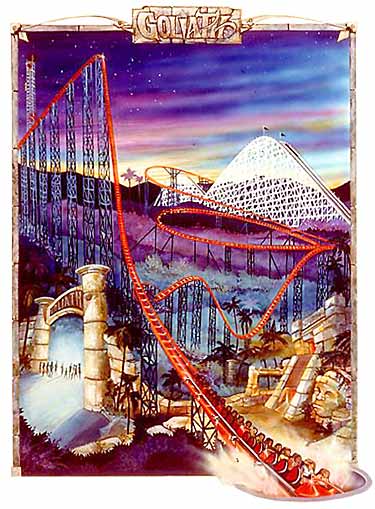 In the spring of 2000, Six Flags Magic Mountain will unleash the world's third tallest roller coaster. Goliath will lift riders up 255 feet above the ground and then shoot them back down at 85 mph into a 120 foot long tunnel. This 3 minute ride will feature a very twisted array of turns and air-time hills that will produce plenty of negative and positive g forces. This ride will be the first coaster that Giovanola has built, even though they have been around for a while crafting coasters for other companies. It seems that this gigantic creation will insure their name in the roller coaster biz for many years to come.