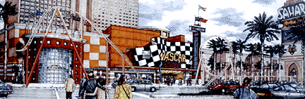 Las Vegas has once again added another amazing thrill ride to their count. Speed: The Ride will be located in the Nascar Cafe, through the Sahara Hotel & Casino, down the strip, and 224 feet in the air. You start out inside the Cafe when suddenly Linear Induction Motors blast you from 0 to 40 in 2 seconds. Right after this, you bank 90 degrees into a downward left turn that takes you 25 feet below the strip's road level. After manuvering a vertical loop you hit another launch that takes you from 35 to 70. After passing straight through the Sahara's main sign, you fly 224 feet straight up a tower only to drop back down and do the whole thing in reverse.